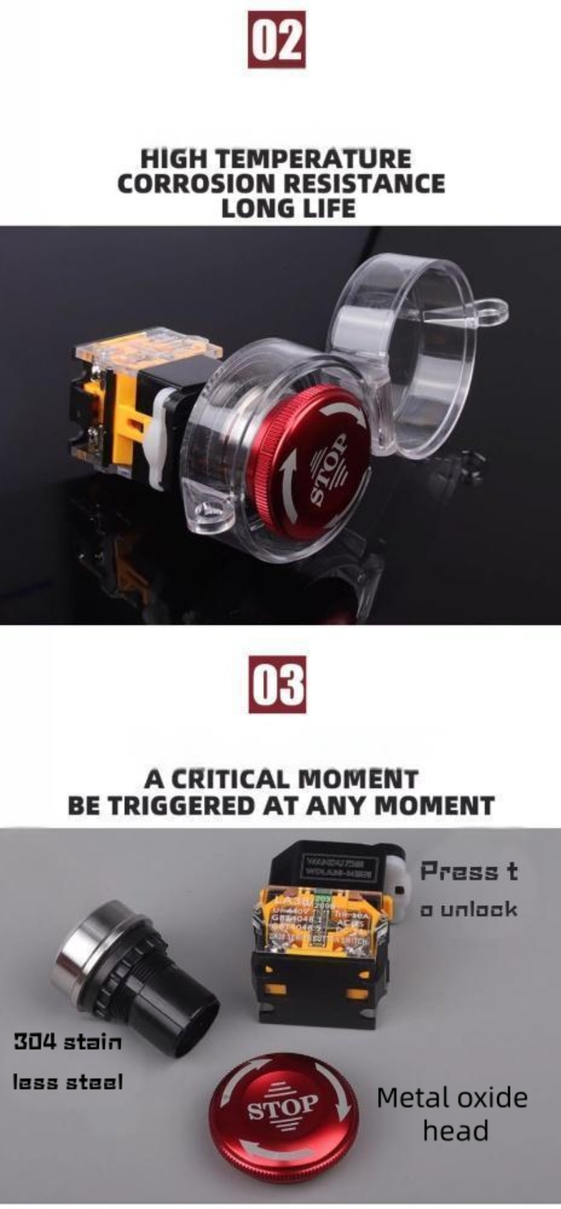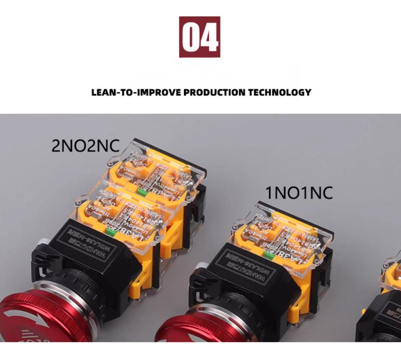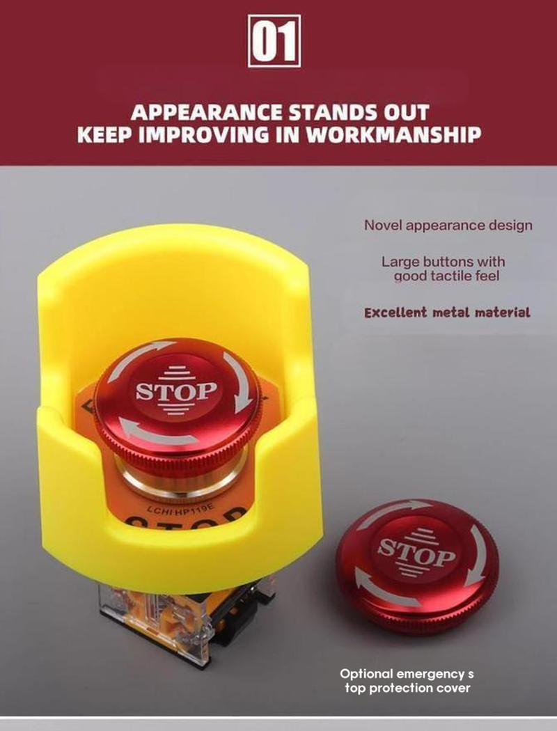 The emergency stop button, often abbreviated as E-Stop in the industry, is a critical safety component.The standard 1NO1NC contact configuration can be customized to a 2NO2NC function.It is widely used in various industries for mechanical equipment, electrical and electronic devices, etc.Constructed with high-quality metal material, it offers excellent pressure and wear resistance, ensuring a long mechanical life and guaranteed quality.