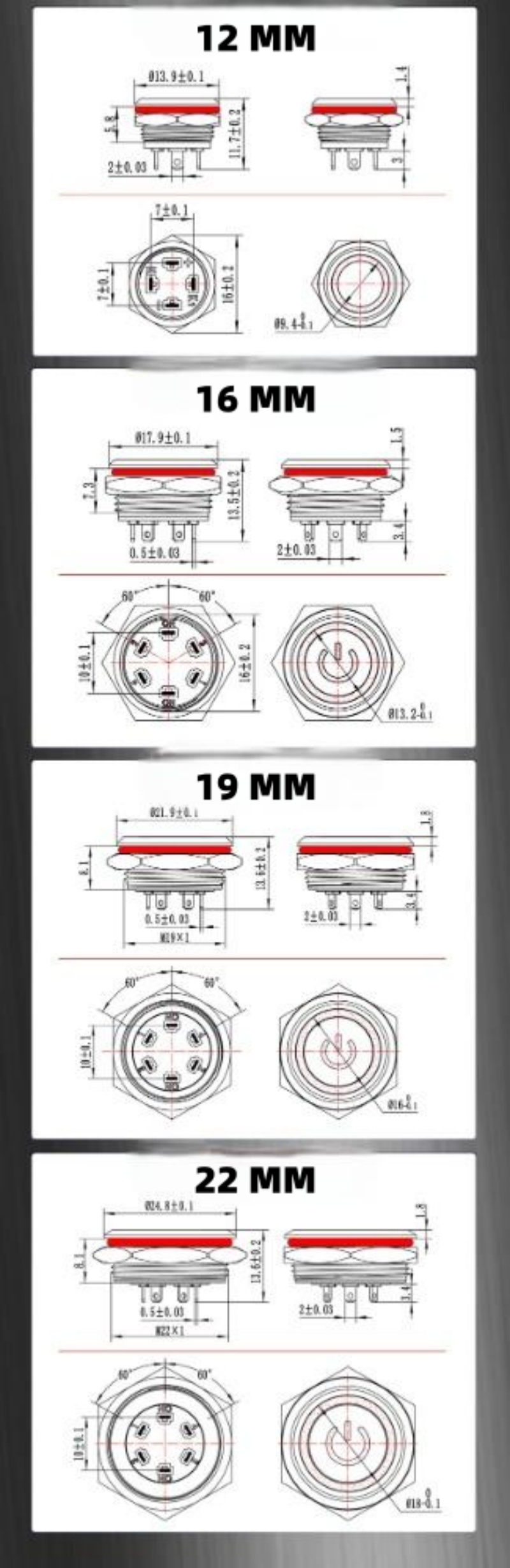 This waterproof black metal sensor switch is available in 12/16/19/22mm short-body sizes with tri-color LED illumination. Featuring momentary operation and pin terminal connections, it provides reliable signal control for automotive retrofit applications.