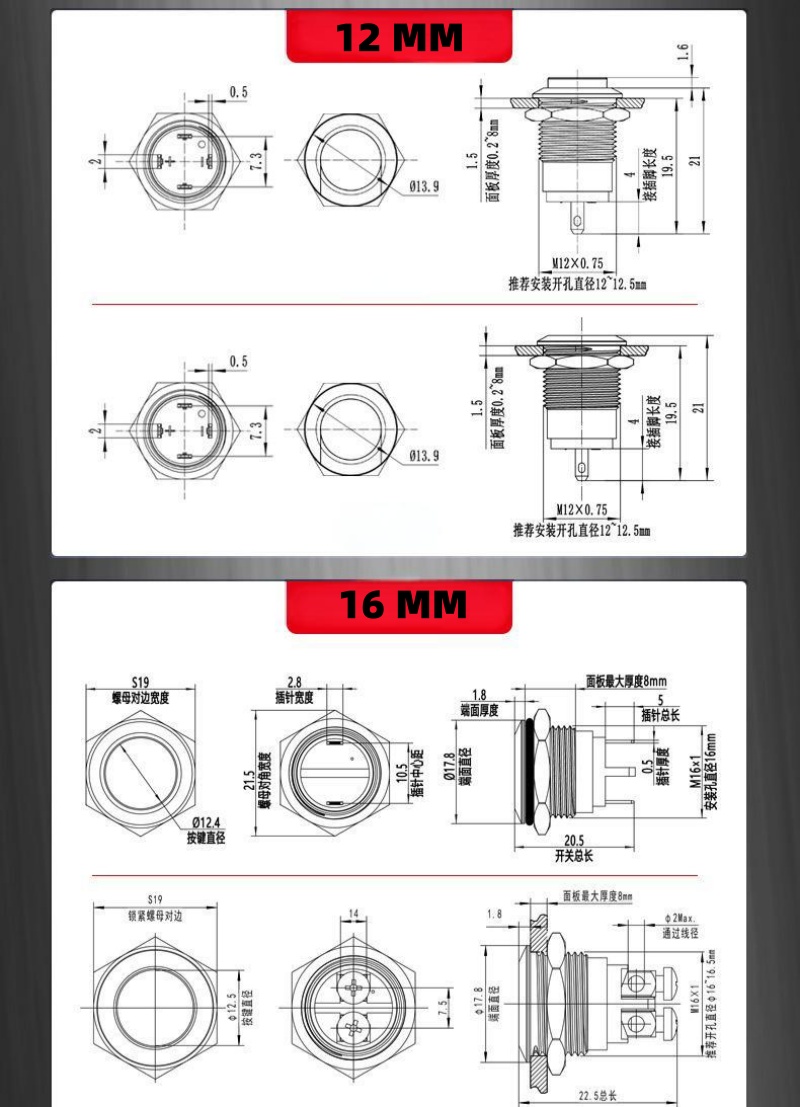 This multi-size metal push button switch (12/16/19/22mm) features screw terminals and waterproof construction. Available with high, flat, or ball heads in non-illuminated momentary versions for reliable operation.