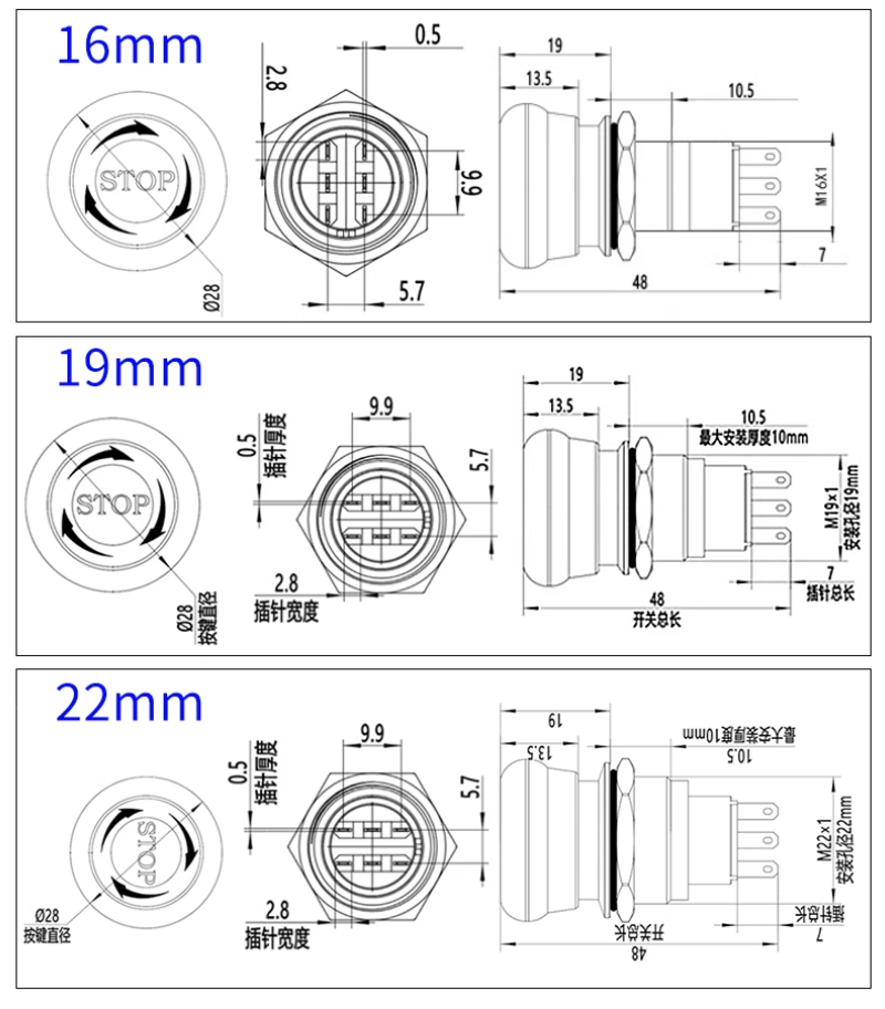 16 19 22mm Metal Emergency Stop Switch Buttons Mushroom Waterproof Metal Material Maintained