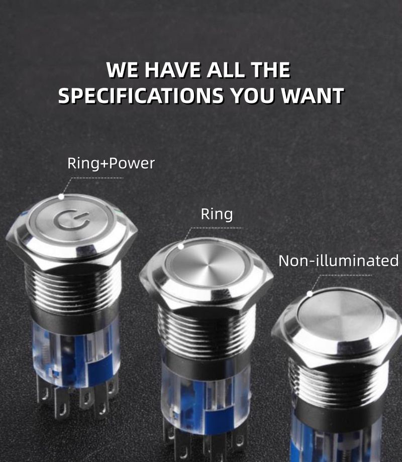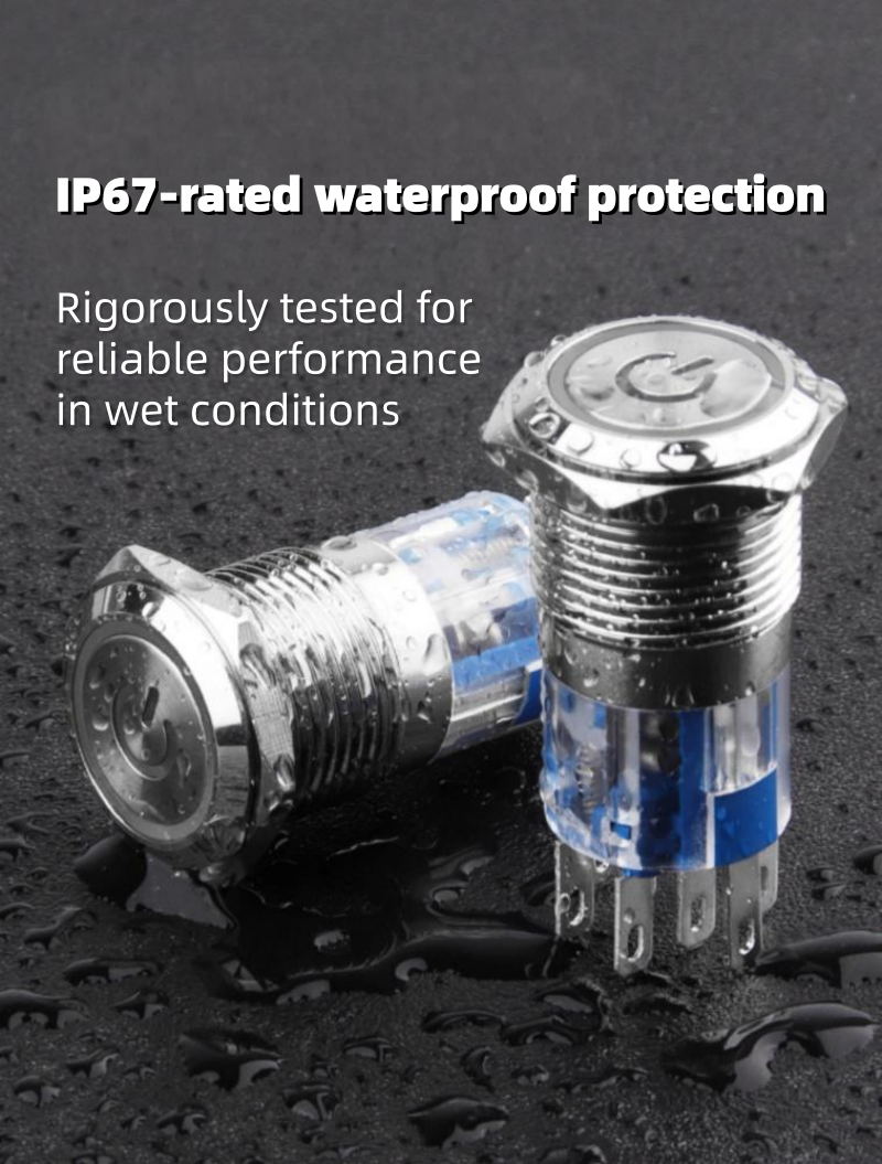 A dual-channel control switch with a light, featuring IP67 waterproof and dustproof rating and multiple LED color options. The 16mm adopts silver-plated pins to achieve efficient dual-circuit control and excellent conductivity.