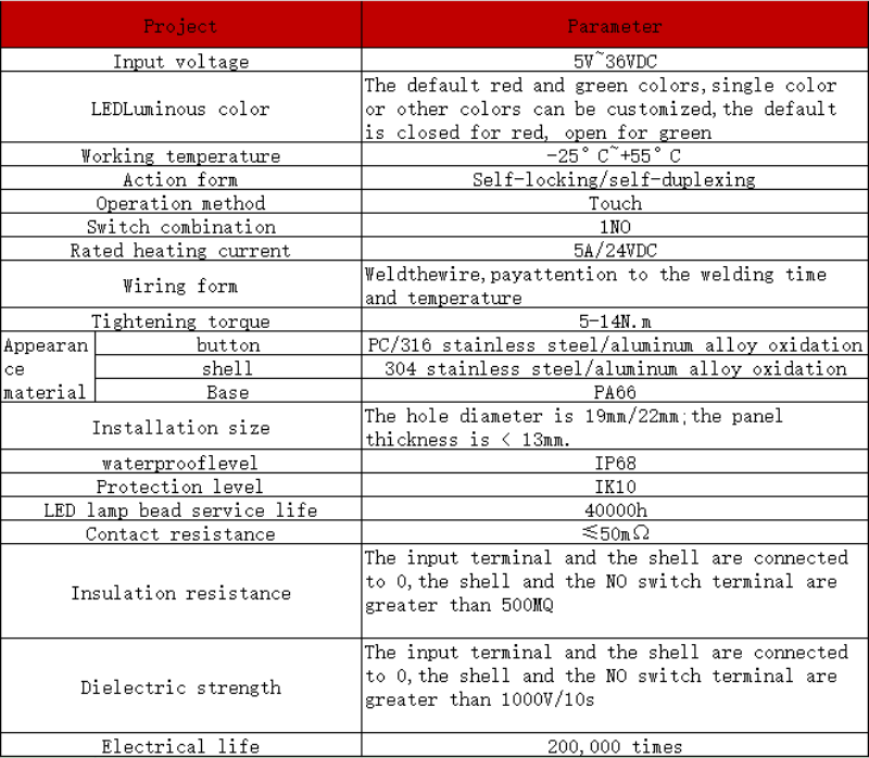 This modern 19/22mm stainless steel switch features capacitive touch technology and a bright LED. With an IP67 waterproof rating and a pre-attached cable, it offers a durable and easy-to-install solution for professional equipment.