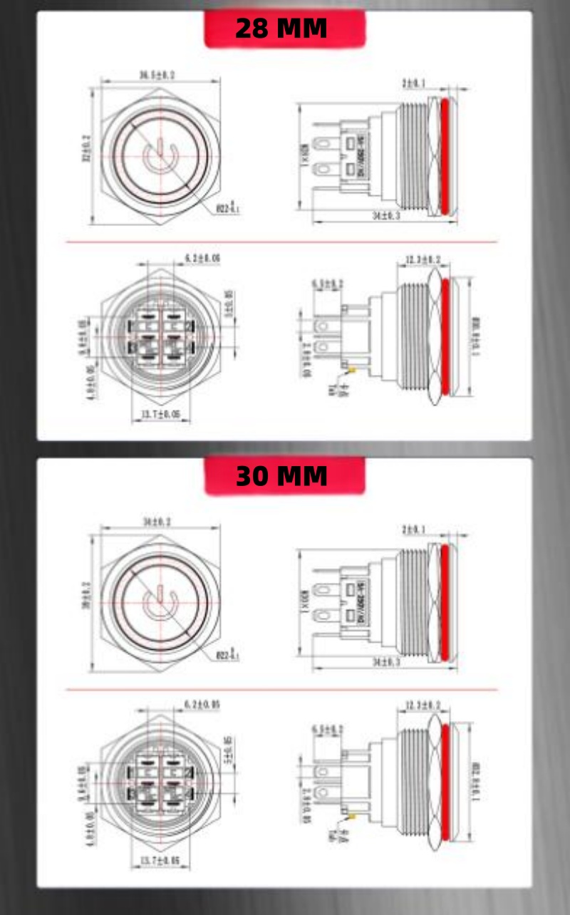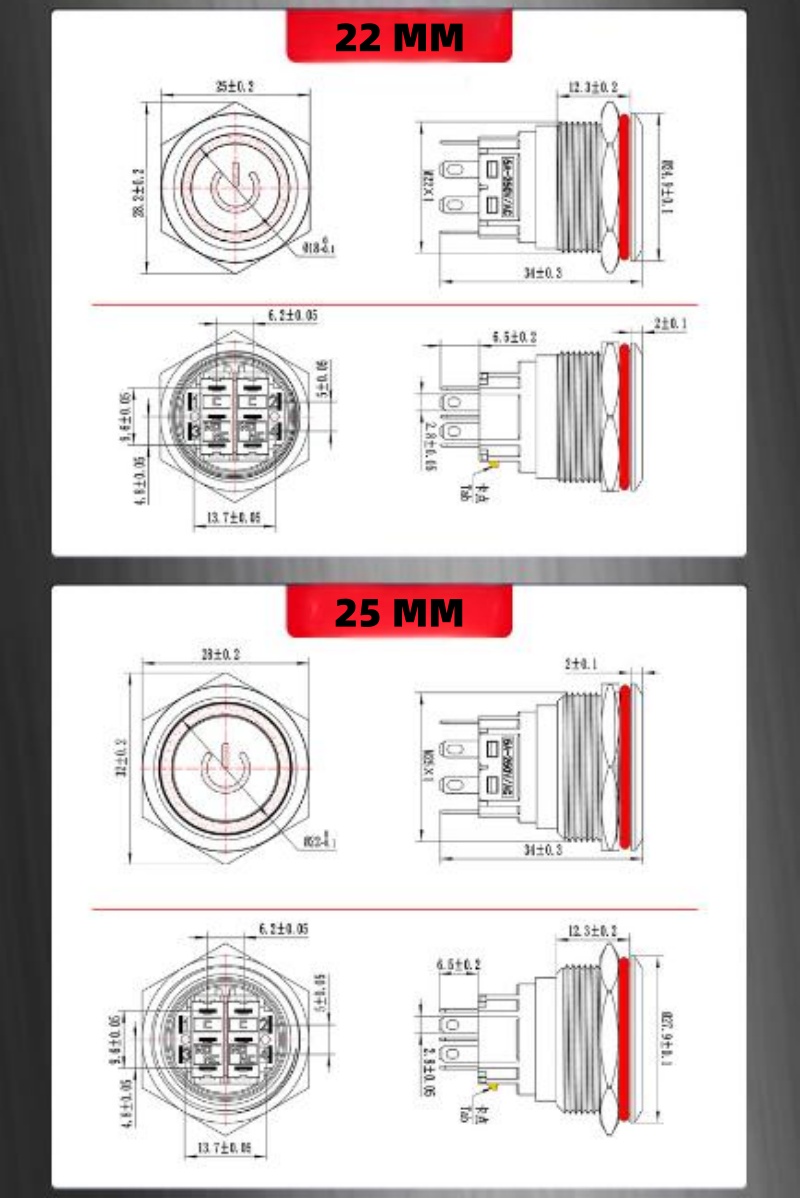 This black oxide metal push button switch is available in 22/25/28/30mm sizes with ring-type design and maintained/momentary operation. Featuring waterproof construction and pre-wired connection, it ensures reliable power start for automotive applications.