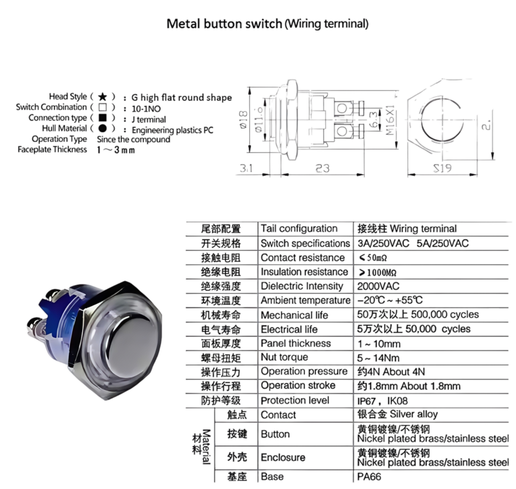 • High Head Color Body IP65 IK02 3A Plastic 16mm Reset Momentary Screw Terminal Mini Short Body Button Metal Push Button Switch